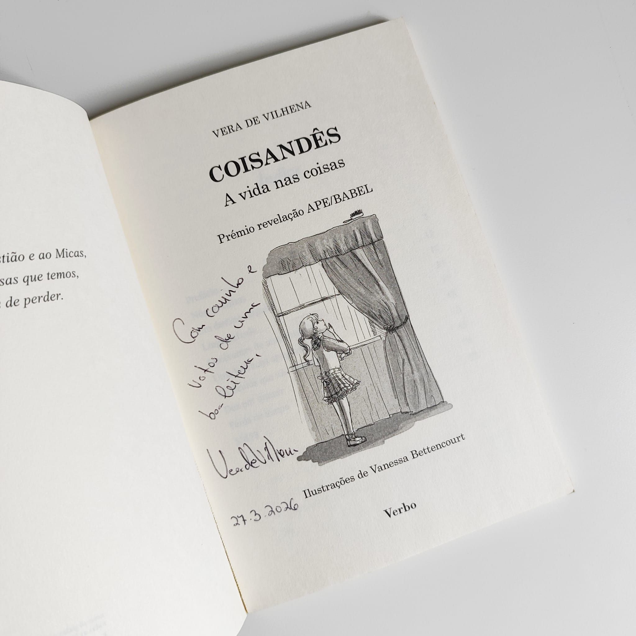Existem 2 exemplares deste livro, cada um com a sua página de licitação. Consulta o regulamento para estes casos. «Coisandês — A Vida das Coisas» é uma coletânea de contos para adolescentes da autoria de Vera de Vilhena, com ilustrações a carvão de Vanessa Bettencourt, publicada pela Verbo/Babel em abril de 2014. Obra premiada com o Prémio de Revelação APE/Babel na categoria de Literatura para a Infância e Juventude, reúne histórias que exploram o universo das coisas e dos objetos do quotidiano, conferindo-lhes vida e significado. Uma escrita intimista e poética que convida os jovens leitores a um olhar diferente sobre o mundo que os rodeia.