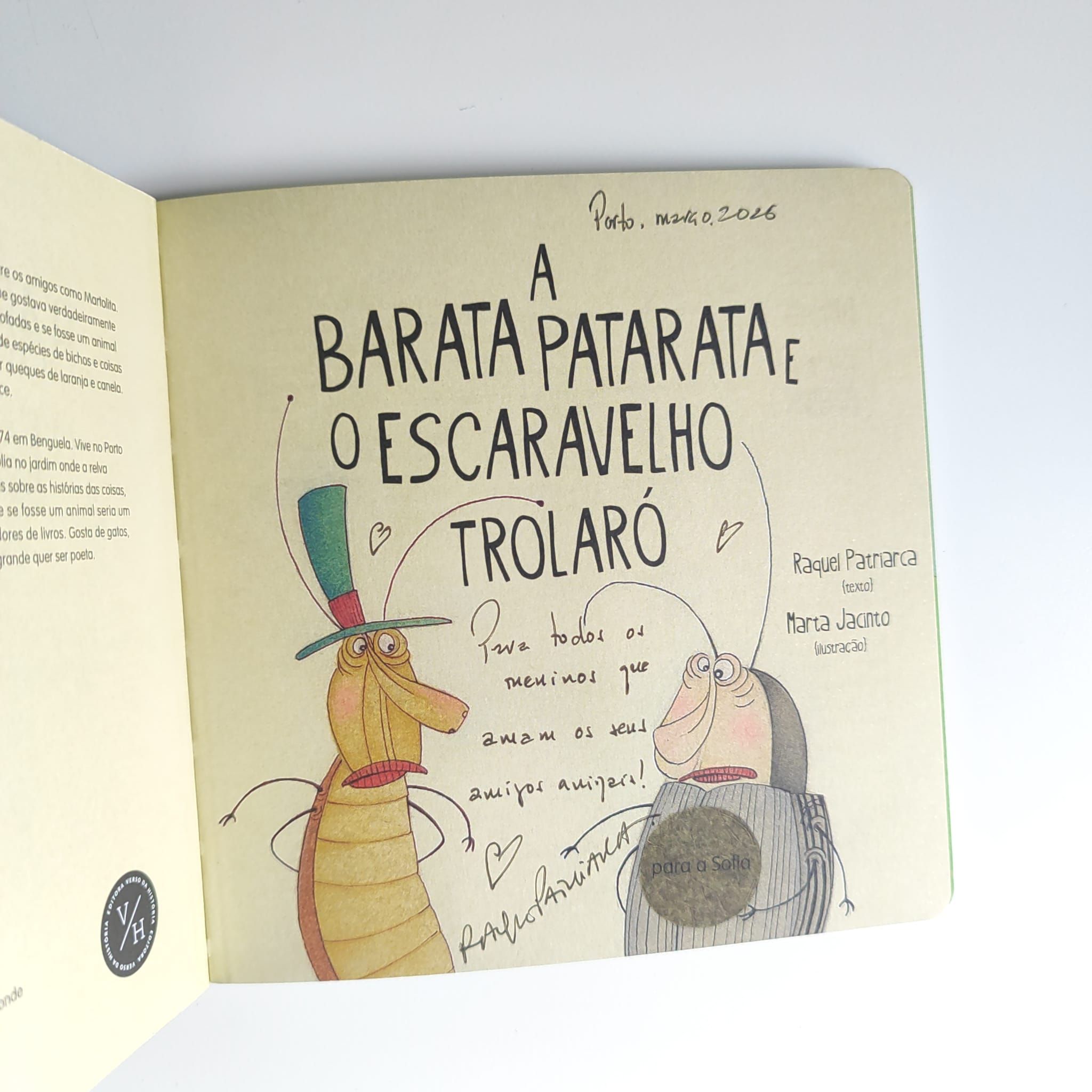 O que têm em comum uma barata patarata e um escaravelho trolaró? São ambos muito papalvos e gostam de tudo muito limpo. As suas aventuras descabeladas vão provocar uma gargalhada franca e divertida e revelar um segredo inesperado: afinal, a palermice não é exclusiva das crianças. Segundo volume da coleção «Livro com Bicho», com ilustrações de Marta Jacinto, pensado para os primeiros leitores dos 2 aos 4 anos.